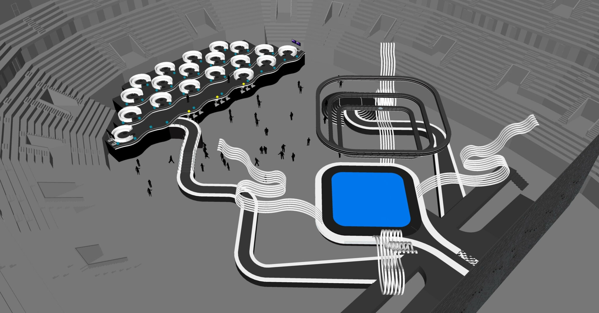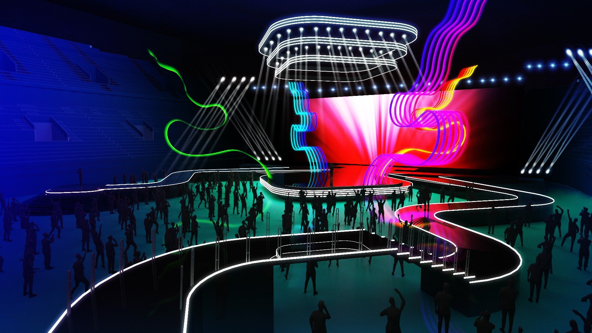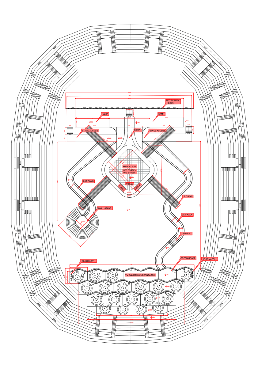 En el lado izquierdo encontramos una pasarela que lleva hasta un escenario más pequeño, mientras que la pasarela del lado derecho conducirá a los participantes hasta la Green Room, situada al fondo y enfrente del escenario, al estilo de algunas ediciones del festival senior.