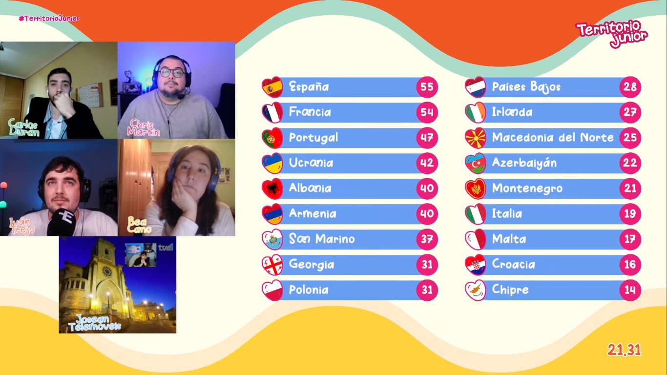 Durante varias semanas en el programa de YouTube Territorio Junior, los colaboradores fueron votando sus candidaturas favoritas entre 1 y 5 estrellas. En la fase final, al terminar todas las votaciones, se realizó un Top 3 adicional que añadió los últimos votos definitivos y se sumó la votación de los espectadores. Finalmente, tras combinar todos los resultados, España se colocó en primera posición, seguida por Francia en segundo lugar y Portugal en el tercero.