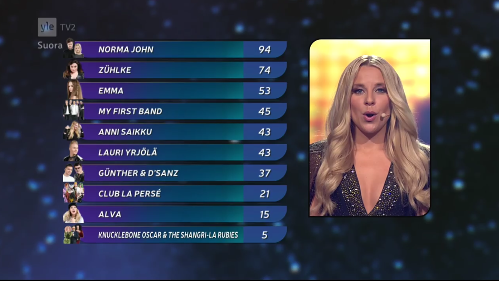 Krista Siegfrids ha sido la encargada de conducir la final nacional donde son los 10 participantes se han enfrentado al público y al jurado con el objetivo de convertirse en el abanderado que defenderá los colores de la bandera de Finlandia en Eurovisión 2017.
